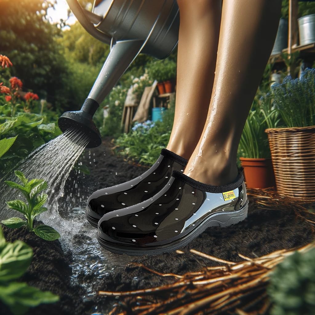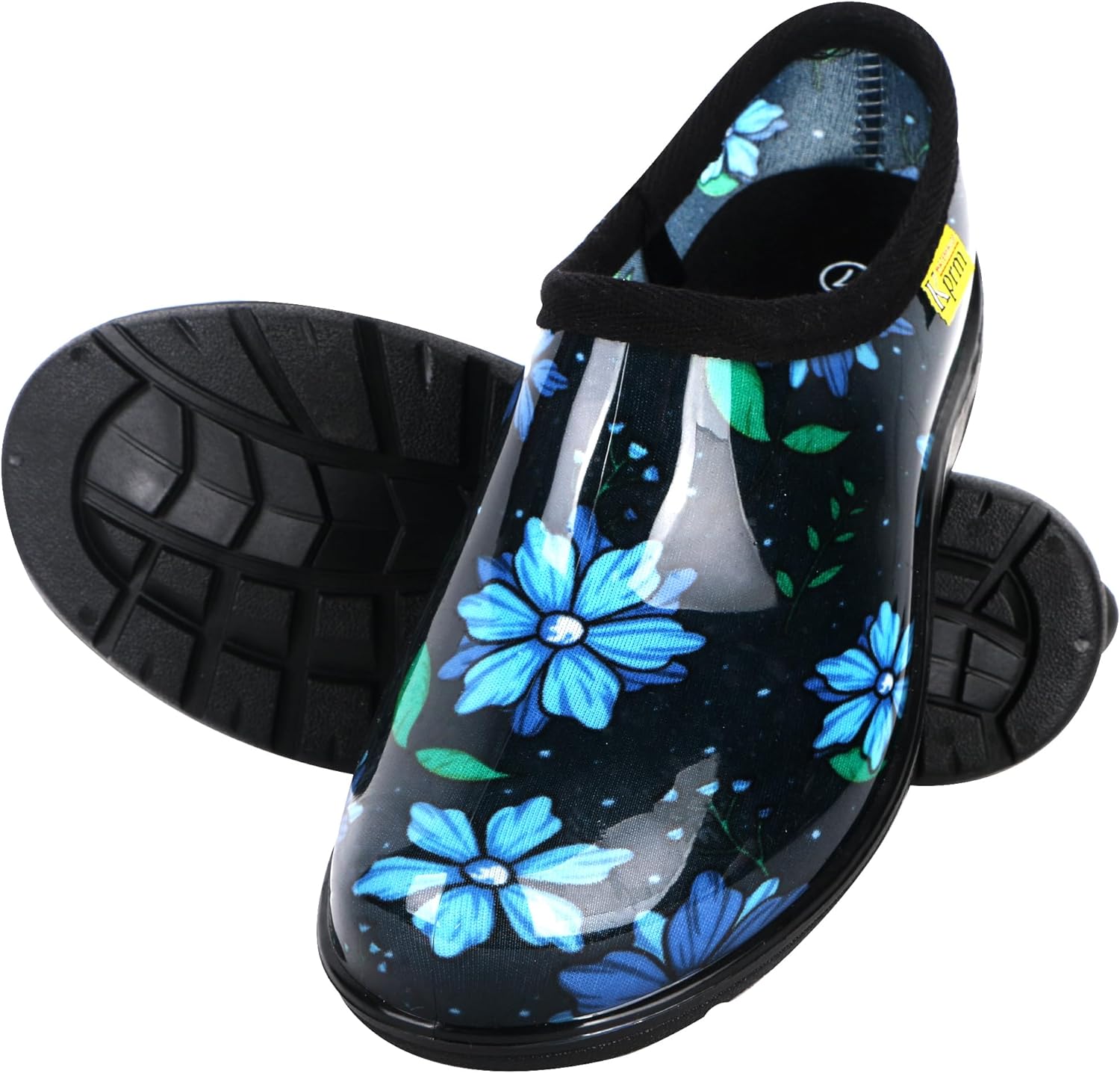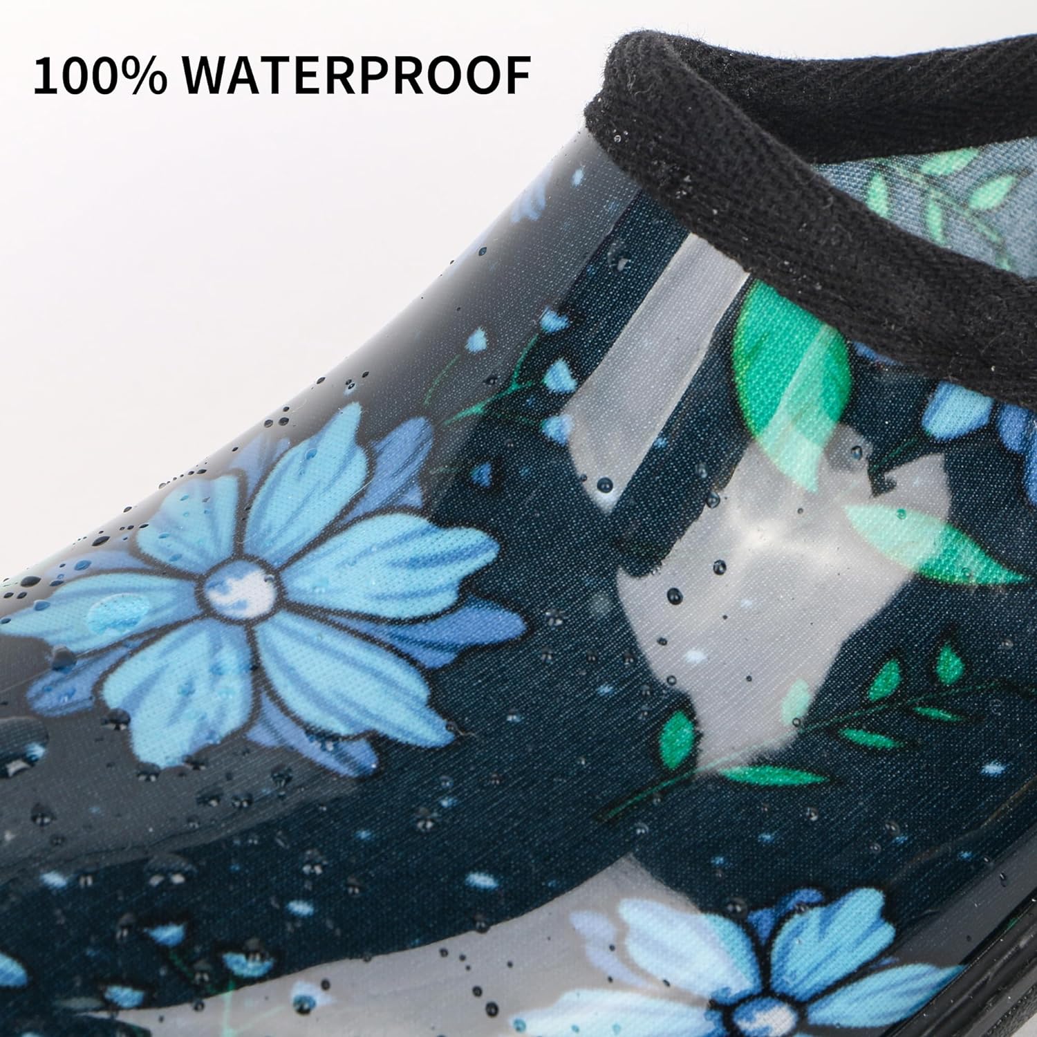 Flat Garden Shoes for Women Waterproof Slip-On Womens Rubber Rain Shoes Gardening Clogs with Comfort InsoleCreate a new description for this product from the title with 500 characters