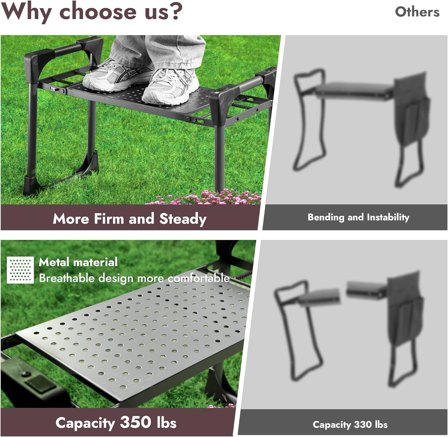 【Holds Up To 350 lbs! 】Gardening work seat is made of steel, which is stronger than the older generation. The reinforced design with four additional protective corners is more ergonomic and suitable for long-term gardening work.